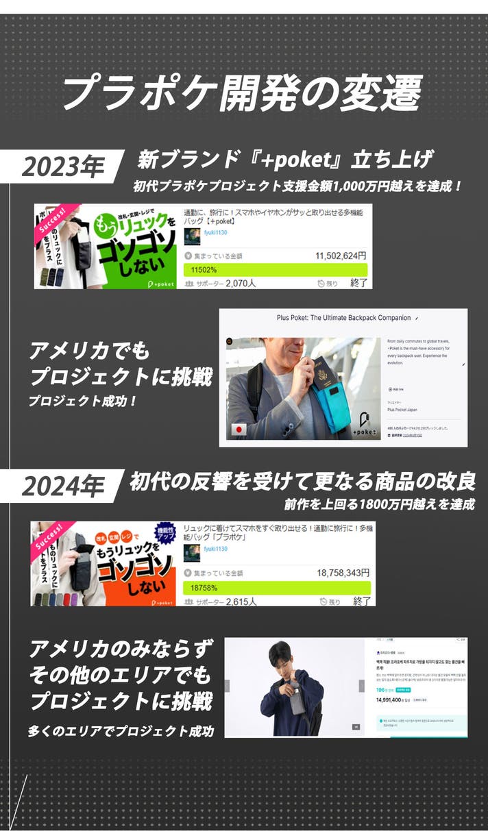 前回の【+poket】はとても大きな反響があり、最終的に海外での販売にもつながりサクセスすることができました。、応援購入総額は1,800万円を突破することができました。