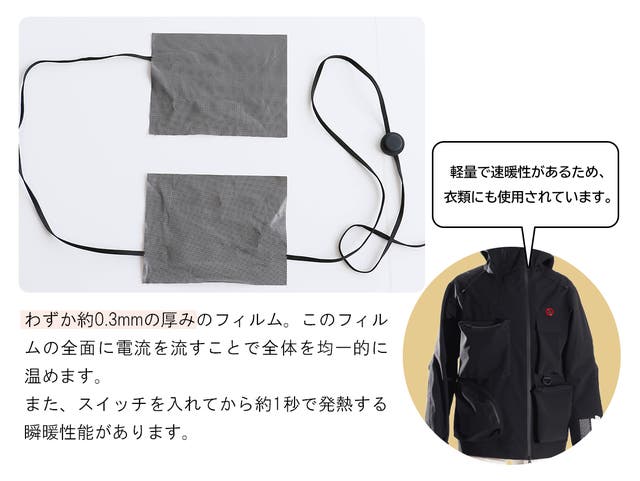 「POCAMO」に使用されている「カーボンナノチューブヒーティングシステム」は従来の熱線式ヒーターと比較すると、細い繊維を編み込むような構造のため、断線のリスクが低いです。