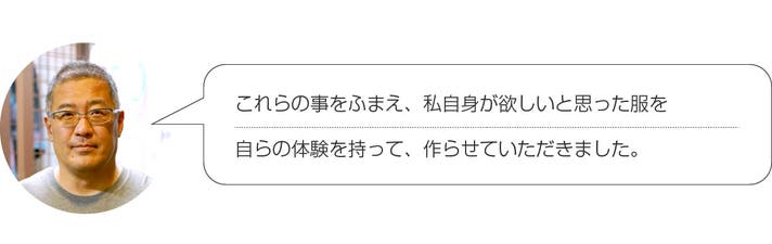 最初のサンプルから、製品になるまで、襟の形、背中のシワ、お腹のカッティング、袖付けなど、素材を含め多くのポイントを変更させて頂きました。