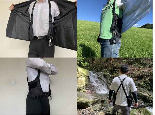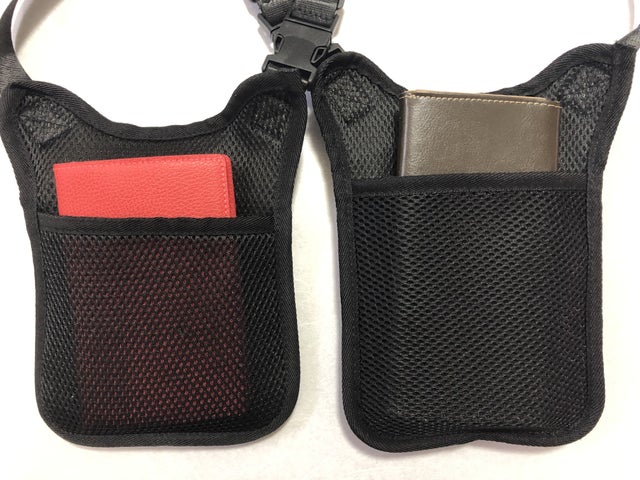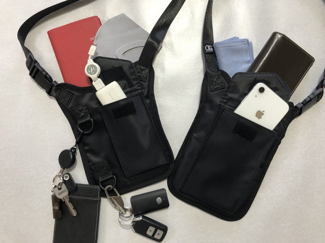 ※スマートフォンと充電バッテリーを片方のポケットに入れますと重みでそちら側に偏ってしまいますので、左右に重さを分散させることをお勧めします
