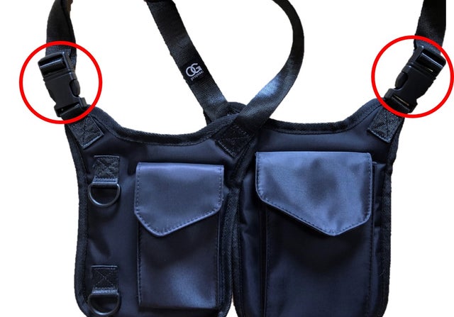 ・背中のベルトにつける「ずれ軽減ループ」を付属しておりますが、片方のポケットに重さが偏りますと、ポケットの位置が重い方へ下がってしまう事があります