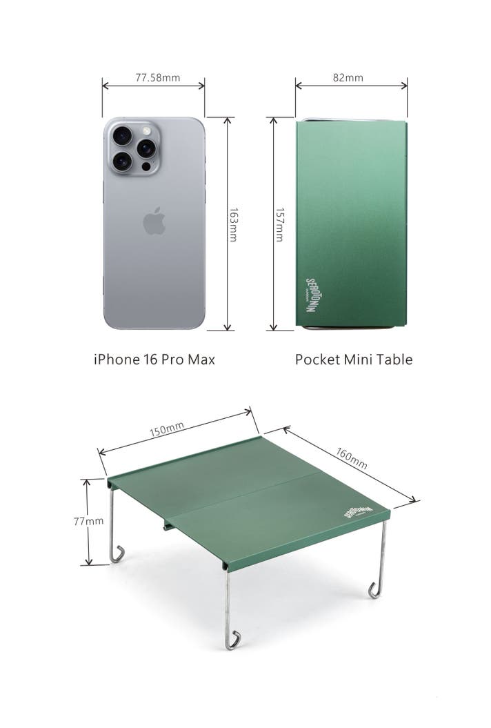 展開サイズ16cm x 15cm x 7.7cm、折りたたみサイズ15.7cm x 8.2cm、重さはわずか137gの超コンパクトな折りたたみテーブルです。