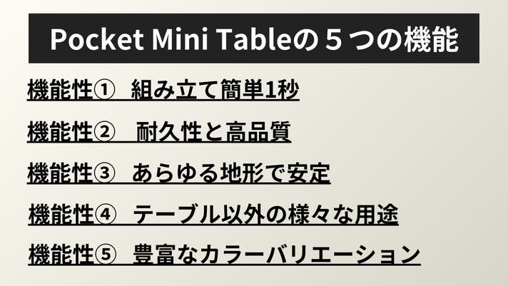 「Makuake(マクアケ)」は、実行者の想いを応援購入によって実現するアタラシイものやサービスのプラットフォームです。このページは、 プロダクトカテゴリの 「【わずか137g】ポケットから1秒で展開。どこでも快適空間を生み出すミニテーブル」プロジェクト詳細ページです。