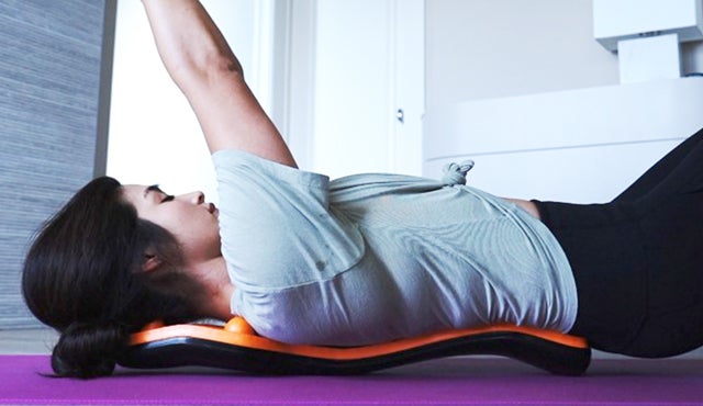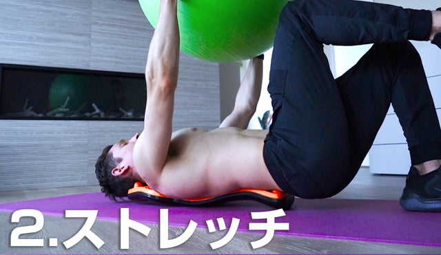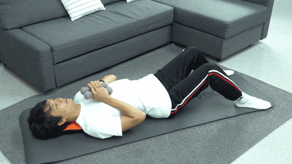 横になるだけで十分指圧ケア効果がありますが、ストレッチをより強めにされたい方はバランスボールやダンベルを同時に使いストレッチの強度を高めてください。