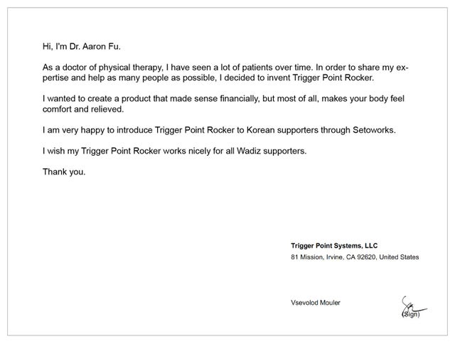 リハビリを受けに来る患者のほとんどが間違った姿勢により生活が不便だという方が多かったため、私の専門を生かして多くの人々が気軽に楽に使えるトリガーポイントロッカーを発明しました。