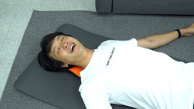 トリガーポイントロッカーの上部ボール2個を首の背面部に来るように当てると、自分の体重でそっと押さえながら筋肉をゆっくりほぐします。