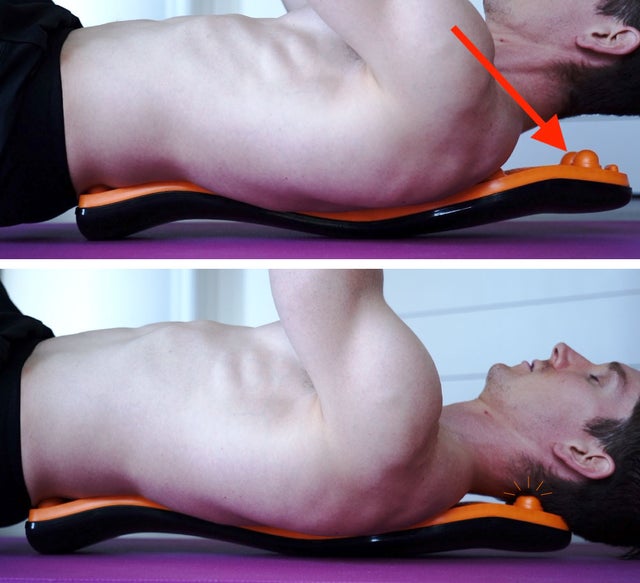 トリガーポイントロッカーの上部の2つの指圧ボールが硬くなった首の筋肉をほぐします。