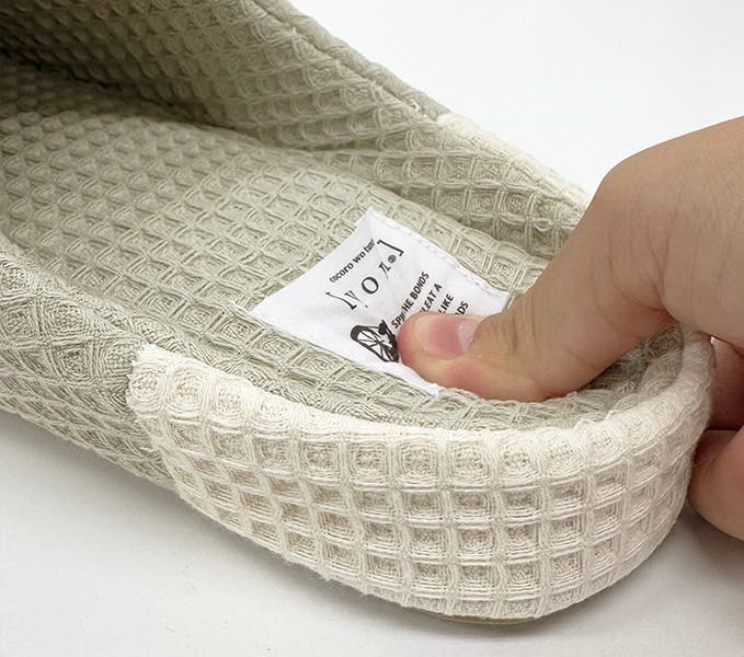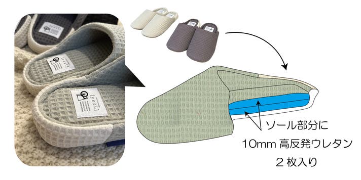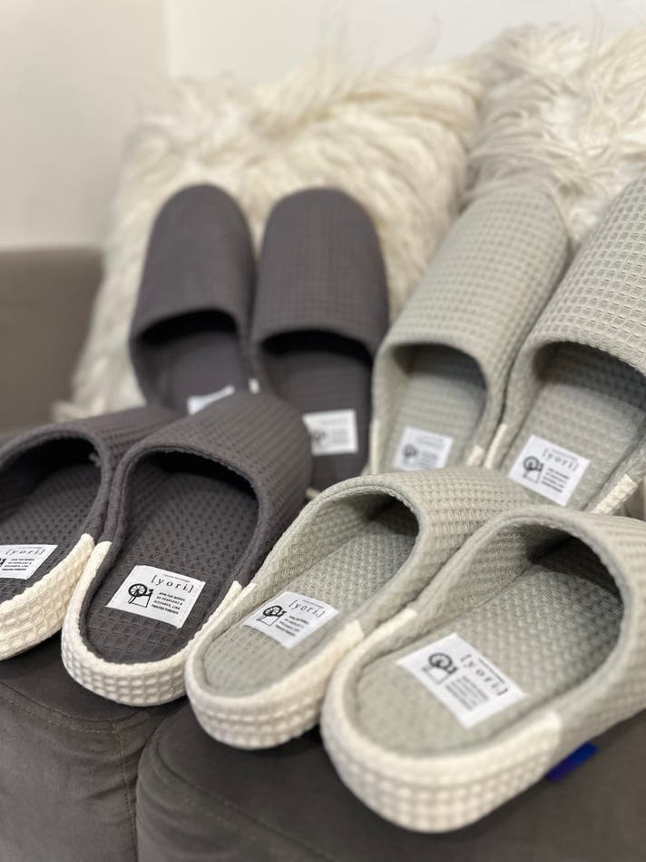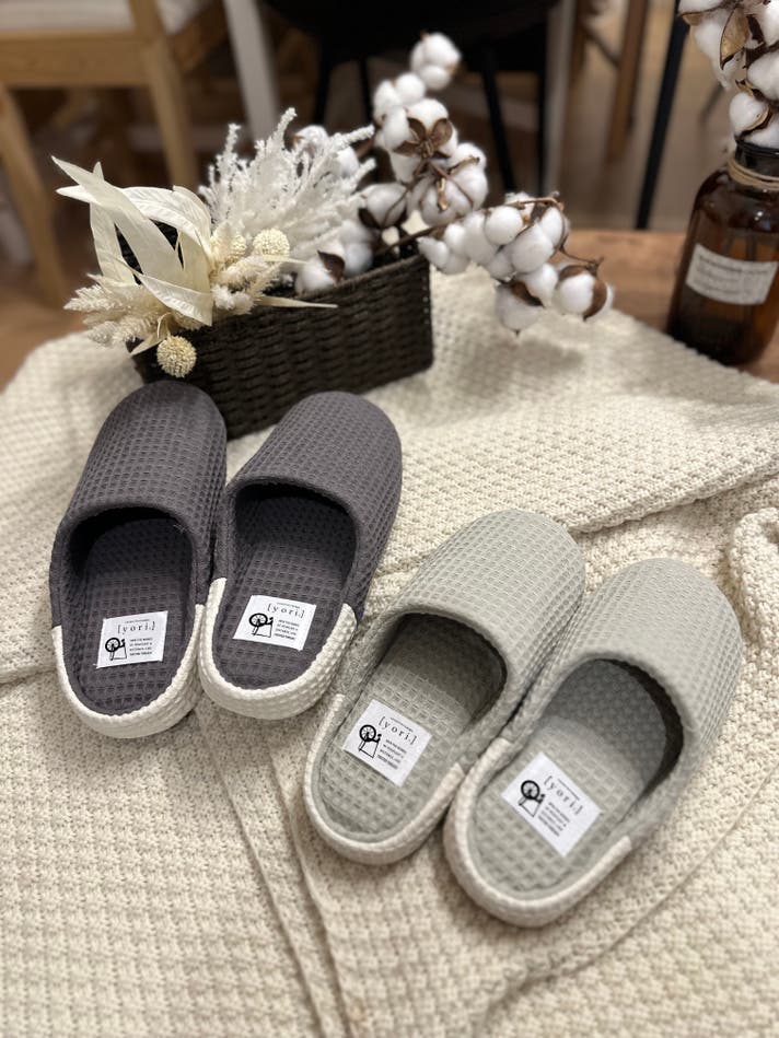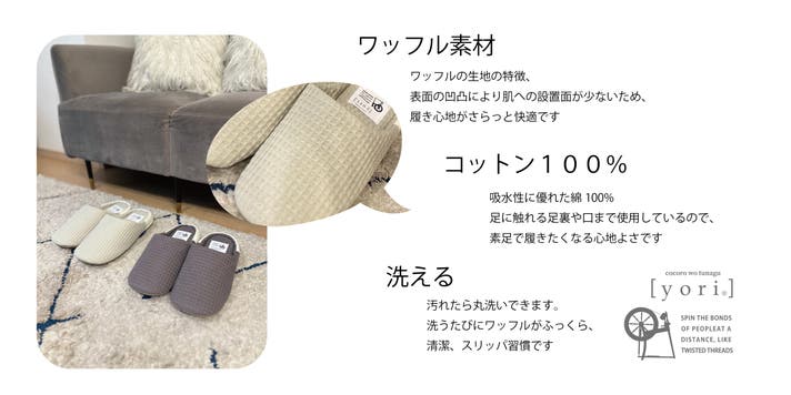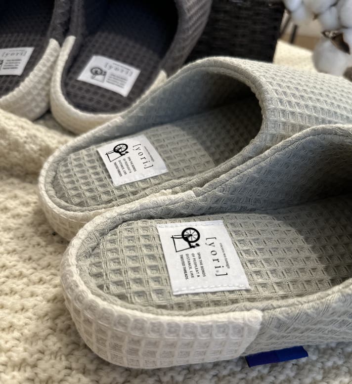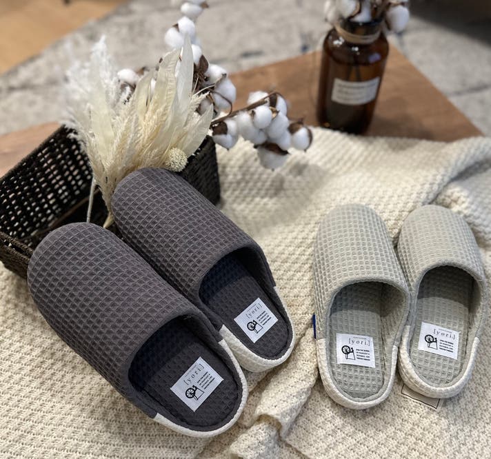 生地には、明治28年創業、130歳を迎える老舗スリッパメーカーが独自開発した、綿100%ワッフル生地『yori』を使用。