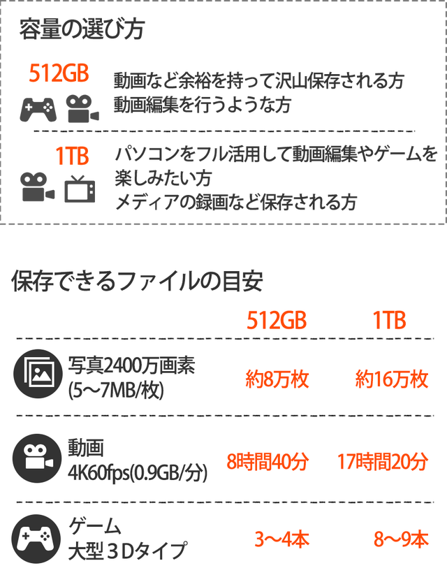 - ミニマムサイズだけど大容量!512GB、1Tの2種類からストレージを拡充可能