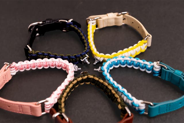 - 首輪とリードの素材は2.5mmミシン縫い牛革とパラコード手編み製作。高い強度をカラフルに両立。
