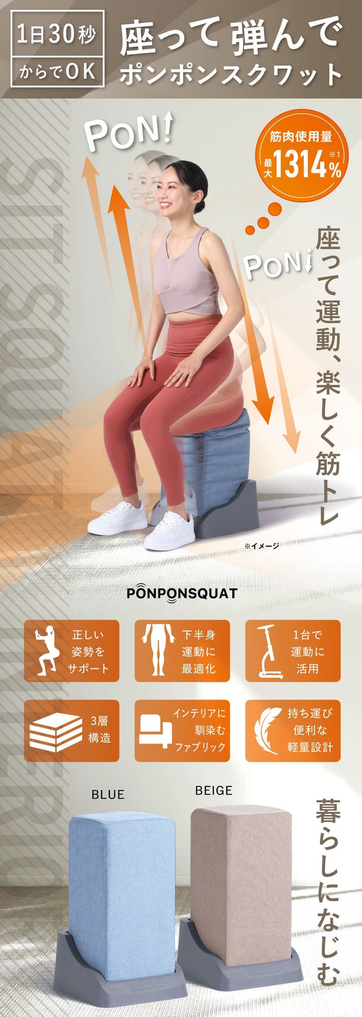 この大切なスクワット運動をより安全で効率よくできるのが「ポンポンスクワット」です。スクワット運動をご自宅で手軽に取り入れて習慣化し、人生100年時代、10年後も20年後もずっと健康的に活動できる、ご自身のカラダ作りに役立てて頂けるとうれしいです。是非お試しください。