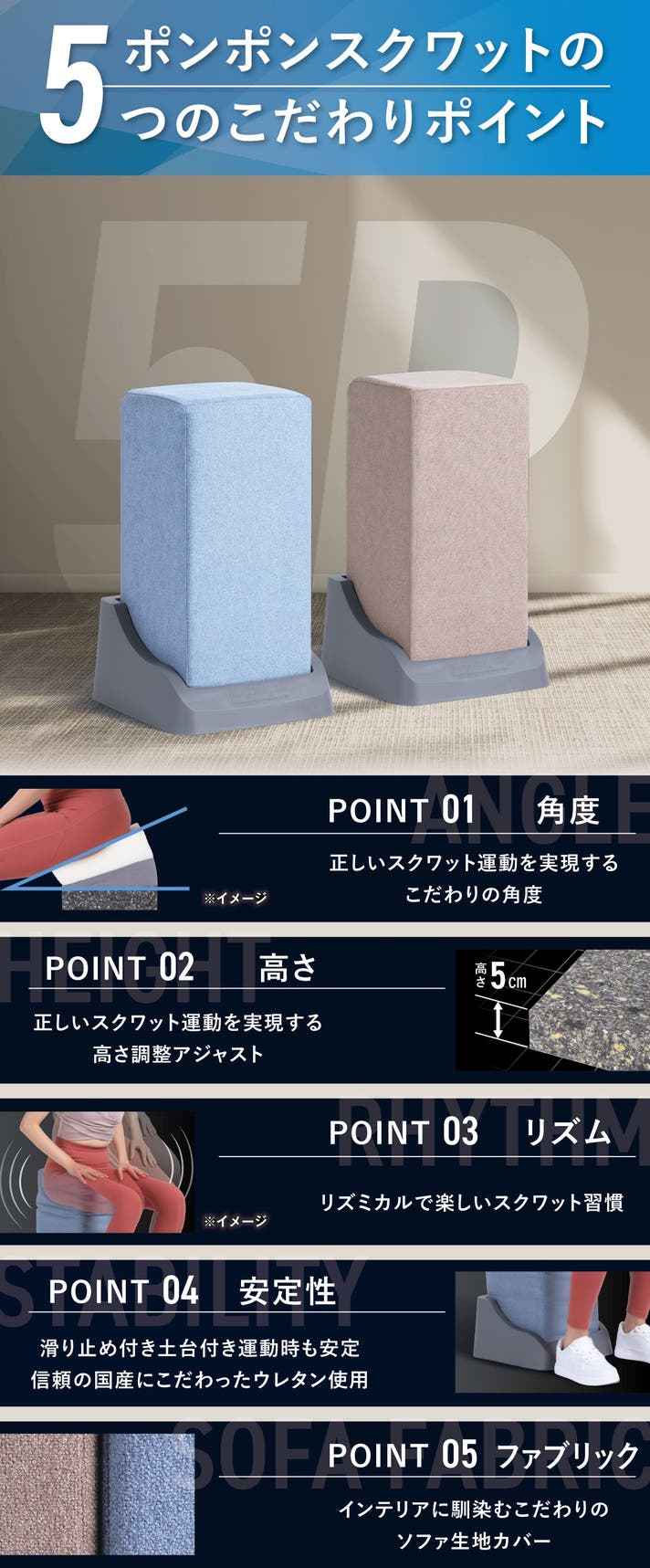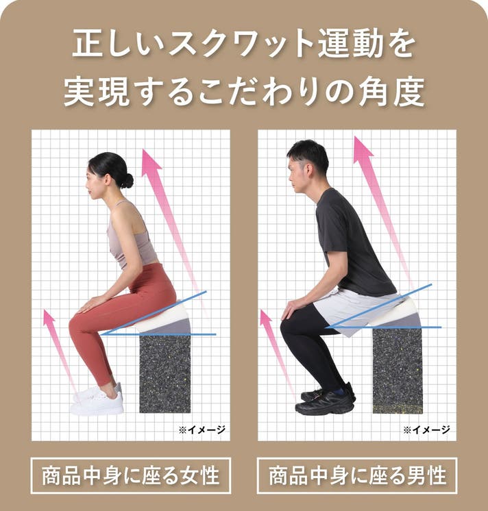 スクワット運動の正しい姿勢(正しいフォーム)には「角度」がとても重要となります。ポンポンスクワットは、ミドル層にソフトウレタンを構成しており、男女どんな方が使用しても理想的なフォームに導きます。