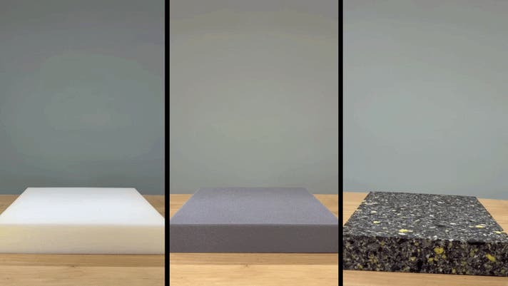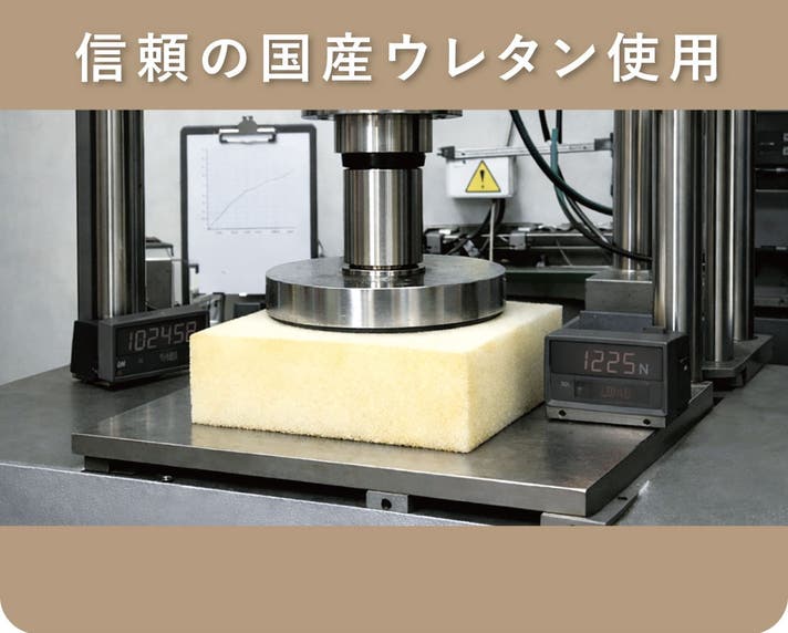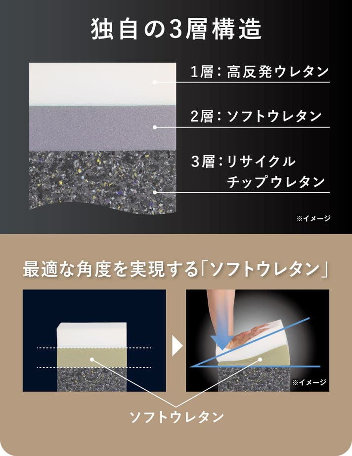 第一層にはリズミカルにスクワット運動を実現する高反発ウレタン、第二層には最適なスクワット運動の角度を実現するソフトウレタン、最下層の土台部分には最高硬度のリサイクルチップウレタン層によって構成されています。