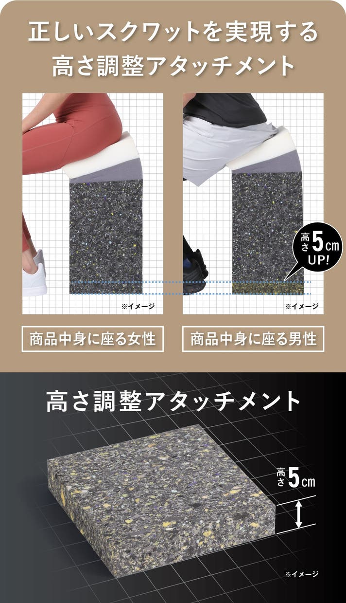 ポンポンスクワットには、付属のアタッチメントがついています。約5cmの高さ調整を簡単に行えるので、ご夫婦でもご愛用頂けます。
