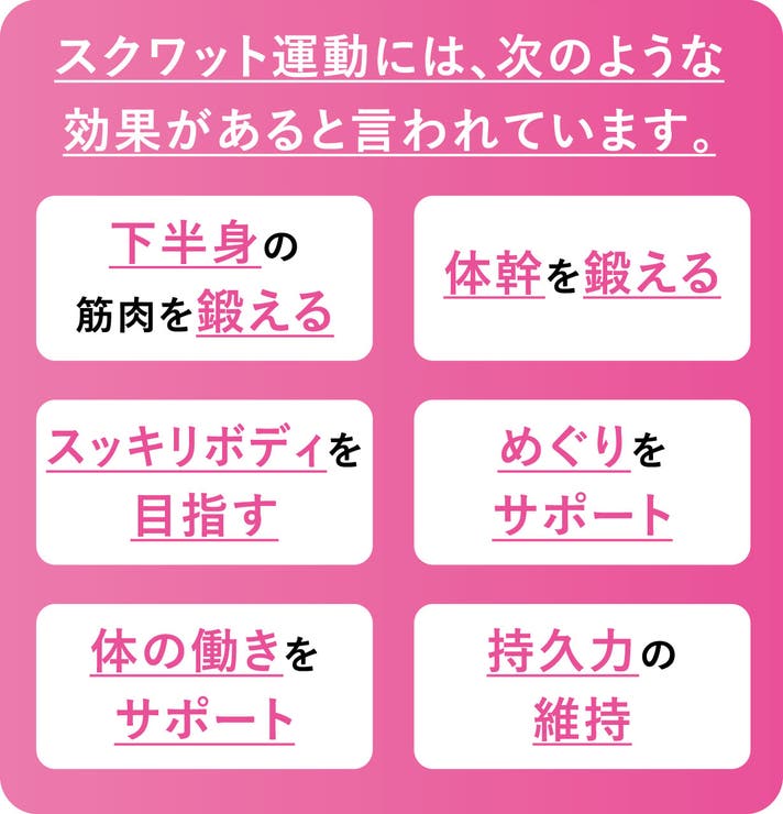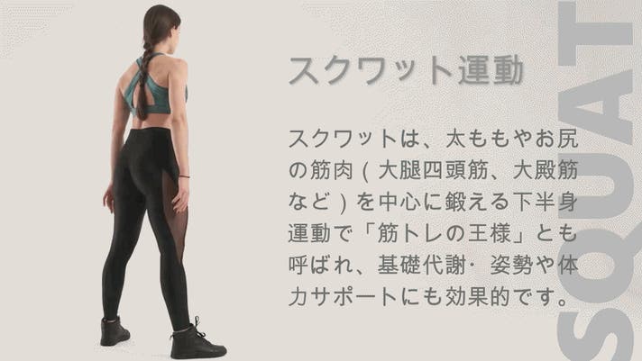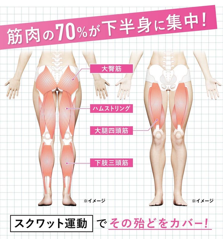 膝と股関節を屈伸するスクワット運動は、お尻、太もも、ふくらはぎなど、下半身の筋肉をまんべんなく鍛えることができる最適解だと言えます。