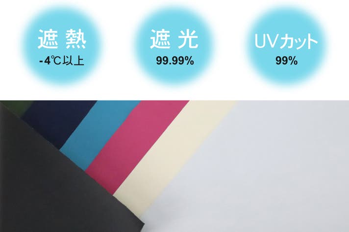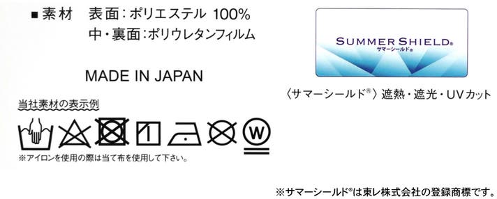 東レが手掛ける国産生地の「サマーシールド」を採用。特殊な三層構造で、太陽光の赤外線・紫外線・可視光線をしっかり遮断!高い遮光性99.9%(JIS L 1055A法)・UVカット率99%、遮熱性-4°C以上(レフランプ法)・耐水圧20,000m性能を兼ね備えた生地です。