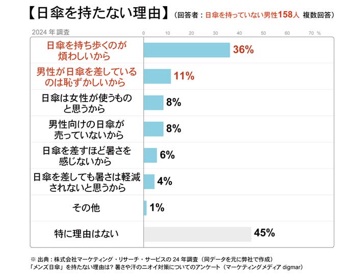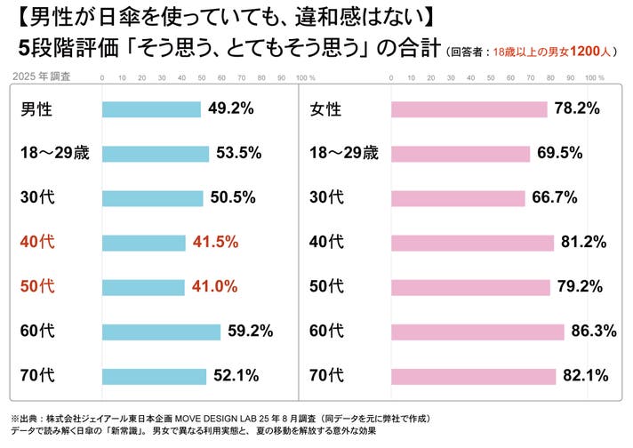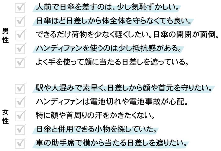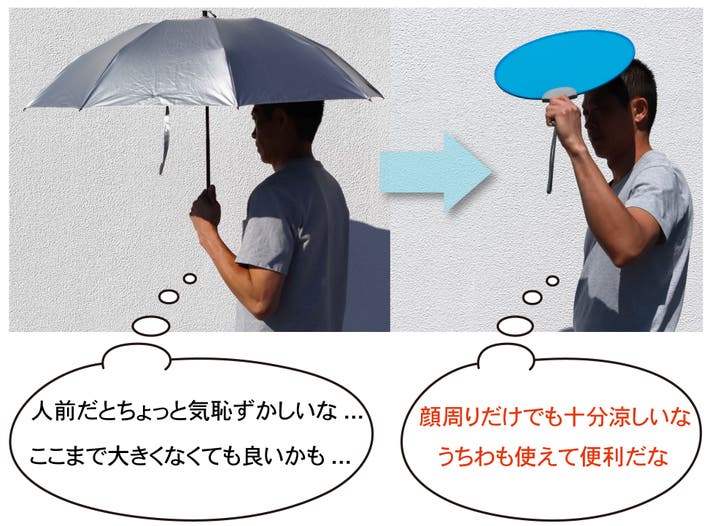 アンケートから男性は日傘を持ち歩くのが煩わしく、気恥ずかしいと感じる人が少なくない、また男性の半数近くは違和感を感じている可能性があることが判明しました。ポントシェードはうちわの延長でさりげなく使えるので気恥ずかしさを抑えます。