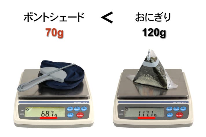 一般的な日傘よりも軽量化に成功。おにぎりよりもはるかに軽量です。
