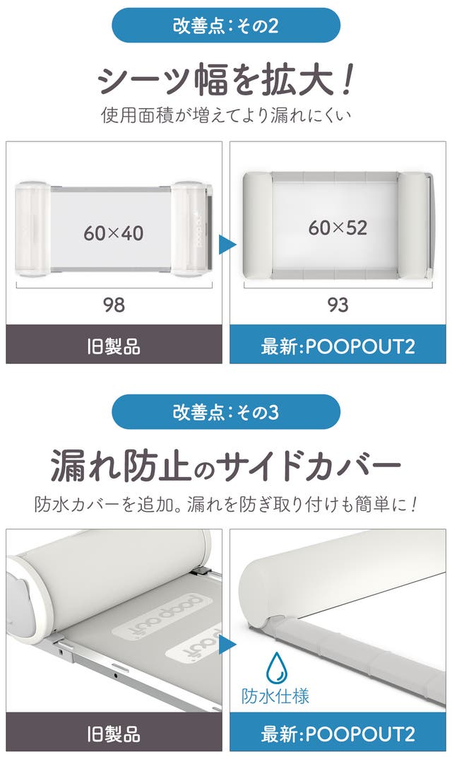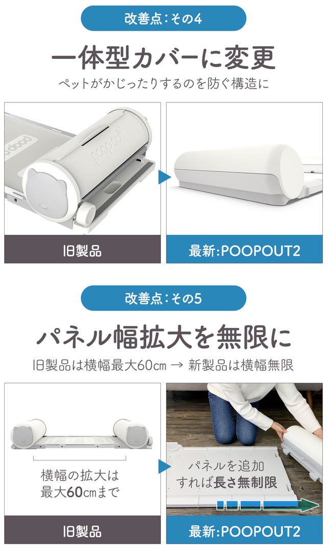 A:POOOPOUT2のペットトイレは防水素材を使用しており、ペットシーツと粘着フィルムを取り外すと、ペットトイレ全体が水洗い可能です。