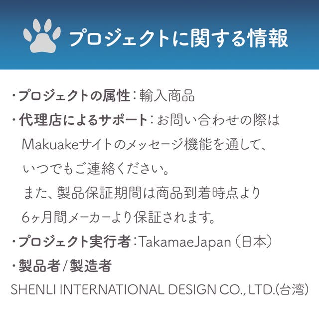 【出荷遅延】予定通りお届けできるよう迅速且つ丁寧に最善の努力を致しますが、予想以上の応援購入があった場合や製造状況、海外輸送中のトラブル、通関時のイレギュラーな事情により、止むを得ずお届けが遅れる場合がございます。早急にご連絡致しますので、予めご了承ください。 【並行輸入品】リターン品の配送が完了するまで、TakamaeJapanはPOOPOUT2の日本における独占販売権を有する正規代理店です。しかしながら、並行輸入品が発生する可能性がございます。並行輸入品は正規代理店のサポートを受けることができない、また関税の適切な処理などが担保されませんので、お気をつけください。 【類似品】一部国内に類似商品が出回っている場合がございます。弊社では他社の類似品に関してのお問い合わせには対応できませんのでご了承ください。 【スケジュール】本文中に記載させていただいたスケジュールは、あくまでプロジェクト公開時点の予定です。応援購入の性質上、配送遅延のおそれがございます。原則として、配送遅延に伴う応援購入のキャンセルはできませんが、リターン配送予定月から3ヶ月を超えた場合には、希望者に限りキャンセルに対応させていただきます。 【返品・交換】お届けから6ヶ月以内に確認された不具合(破損、汚れ、欠品等)は、未使用の場合に限り、直ちに代替品をお届けいたします。(送料は弊社負担)但し、お客様都合による返品、キャンセルはお受け致しかねますのでご了承ください。 【一般販売価格】想定を上回る皆様から応援購入を頂き、量産体制を更に充実させることができた場合、一般販売価格が予定価格を下回る可能性がございます。 【免責事項】本製品使用によるトラブルについては一切の責任を負いかねますので、ご了承ください。 応援購入の性質上、以上の注意点につきまして予めご理解とご了承をいただいた上で応援購入くださいますよう、何卒よろしくお願い申し上げます。 最後に、本製品を受け取られた皆様に喜んでもらえるよう、TakamaeJapanのチームメンバー一同、心を込めて対応して参りますので、 応援の程、よろしくお願い致します。