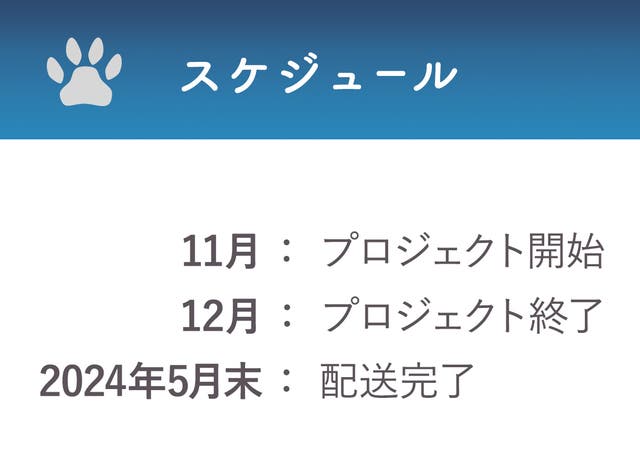 A:はい、ございます。 プロジェクト成功に向けて動いておりますが、製造、輸入状況によって前後する場合もございます。 新型コロナウイルス感染症拡大の影響に伴い、世界各地の工場や輸送・物流に影響が出る場合、 ご案内致しております日程よりも遅延する場合もございますので、予めご了承ください。 状況につきましては適宜活動レポートにてご報告致しますので、ご安心ください。