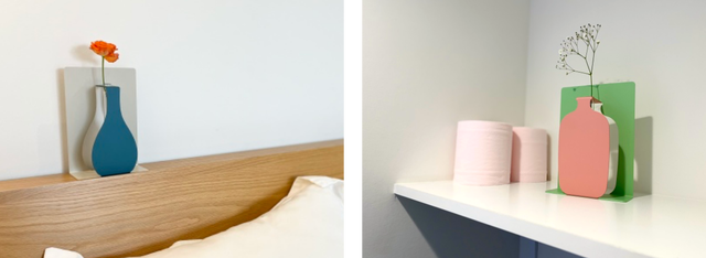 1枚のスチールプレートを折り曲げて作られた一輪挿し。まるで花瓶が立体的に飛び出ているかのような形状はポップな存在感があり、花を上品に生かしてくれます。3色のカラーバリエーションがありますので、花の種類に合わせて一輪挿しを選ぶ楽しさもあります。母の日や誕生日など特別な日にギフトとして花とセットで贈ってみてはいかがでしょうか。