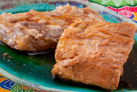 「和豚もちぶた」の軟骨ソーキ肉です。試した他の肉よりも軟骨の部分がとろっと仕上がったのが和豚もちぶたです。霜降りの際に泡盛を使用し、しっかりと臭みと灰汁を取り除いています。軟骨部分がトロトロになるまで5時間以上炊き上げます。