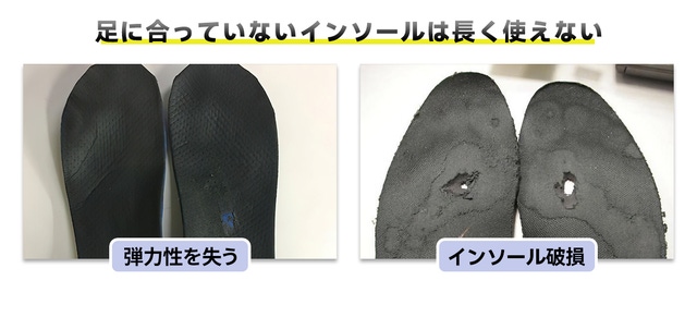 ·柔らかく、衝撃吸収力に優れていても、足裏のアーチをサポートできずに、長く使っていると、体重がかかる部分が凹んで薄くなります。薄くなるにともない、クッション性やサポート力の持続が悪くなります。