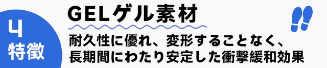 インソールには、形状記憶力に優れたGELゲル素材を使用することで、長期間にわたり安定した衝撃緩和効果をもたらせてくれます。そしてあなたの足に長期的に良い効果をもたらせてくれます。