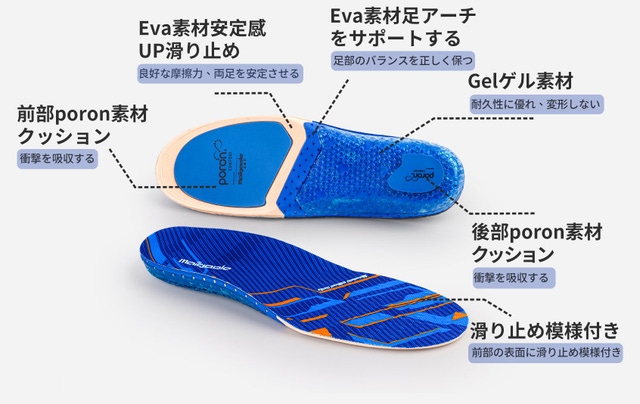 PORON衝撃吸収インソールは革新的で複数の素材を組み合わせることによって、衝撃吸収効果を実現でき、人間工学設計により、柔軟性や衝撃吸収性を備えると同時に、安定したサポート力を提供してくれ、足部のバランスを正しく保つことができます。