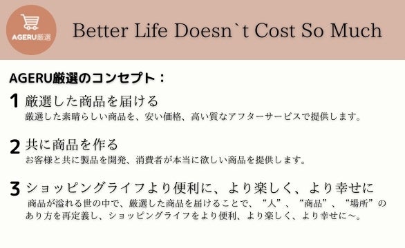 ECショップ「AGERU厳選」では海外の素晴らしい製品を発掘して日本の皆様に紹介すると共に、メーカー様の日本市場への進出のお手伝いをさせて頂いております。初期不良の交換、商品保証、ご購入後のアフターサービスもAGERU厳選ショップが万全に行います。