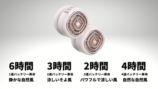 一度のフル充電完了後、1段階の自然風で約6時間、2段階の弱風で約3時間、3段階の強風で約2時間、4段階の自然風で4時間使用できます。