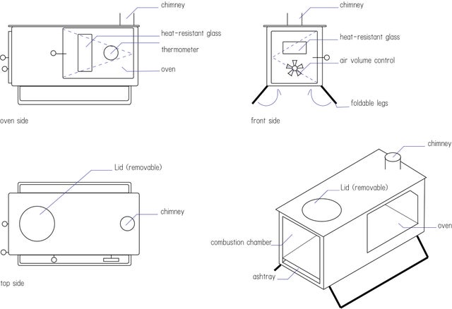 - 持ち運びできる設計。もちろん料理も暖かさも本格的な薪ストーブ。