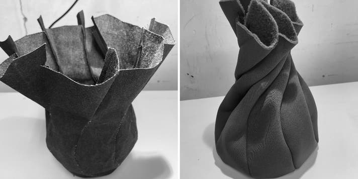 「プリーツをねじって傘のようにできたら、花の蕾みたいにならないかな?」
