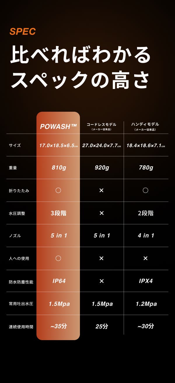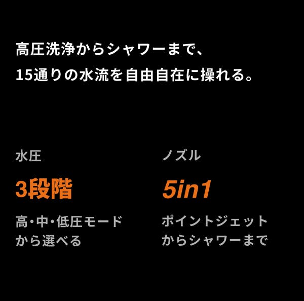 - 【3段階水圧×5ノズル】15通りの水流で泥や油の強力洗浄から肌に優しいシャワーの二刀流を叶える