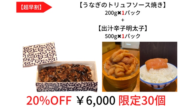 【超早割】限定30個 20%OFF うなぎのトリュフソース焼き+出汁辛子明太子