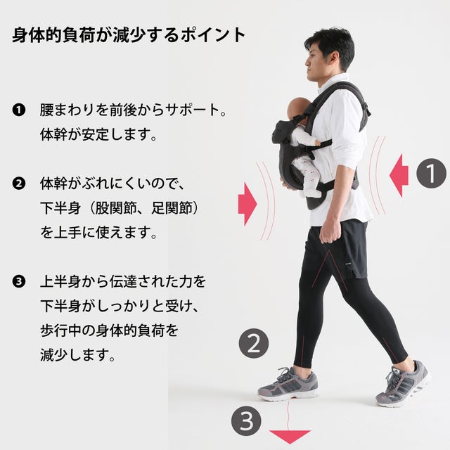 身体のバランスを崩すことなく上半身の力を安定した下半身に伝えることで、身体的負荷が減少。抱っこひもが、快適な歩行を力強くサポートします。