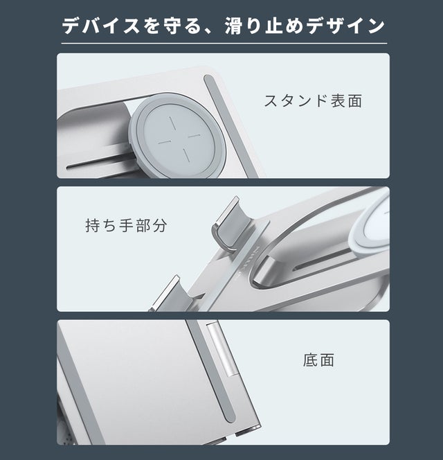 スタンド表面(タブレットとの接触部分)、持ち手部分(タブレットを支える部分)、底面(デスクとの接地部分)、それぞれに滑り止めがついているため、抜群の安定感。