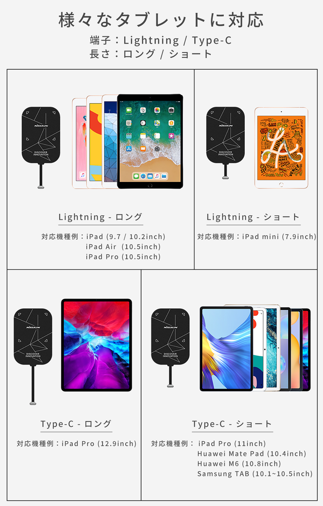 様々なタブレットでお使いいただけるよう、レシーバーの端子・サイズ別に4種類ご用意しています。