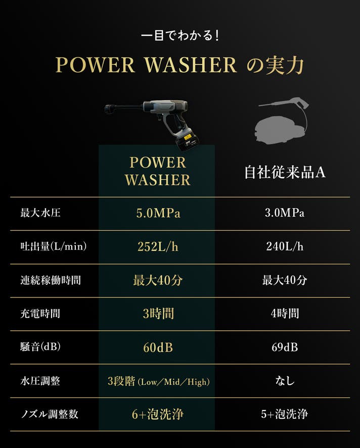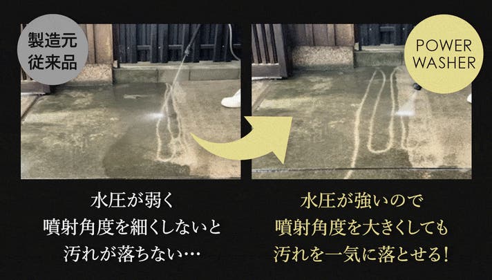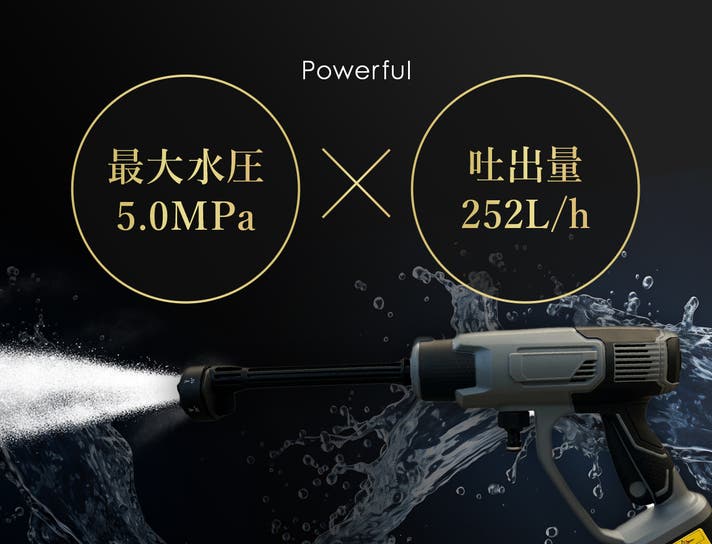 水圧5.0MPa×吐出量252L/hのパワーで、噴射角度を広げても水圧が衰えず、広範囲の汚れを一気に洗い流します。