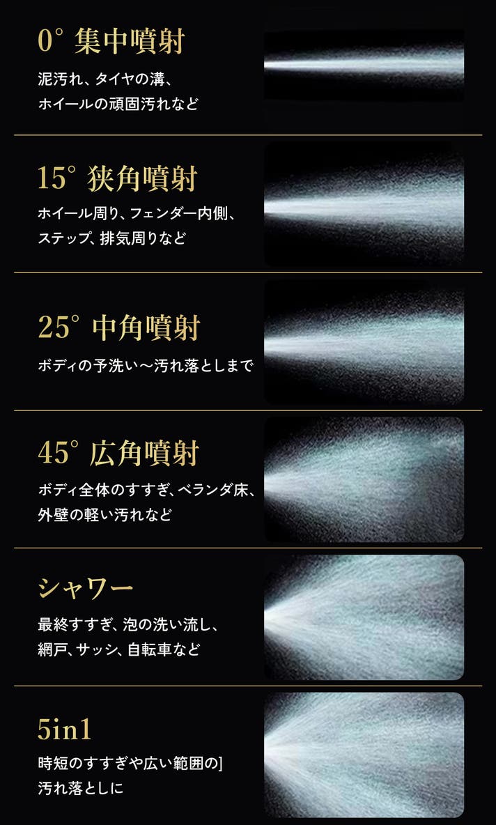 洗車工程に合わせて水圧を切り替えられるため、塗装を傷つけにくく、効率よく愛車をきれいに仕上げられます。