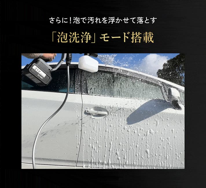 弱モードはボディ表面やガラスなどの繊細な洗浄に、強モードはホイールやタイヤ、泥汚れや砂落としになど使い分けが可能です。