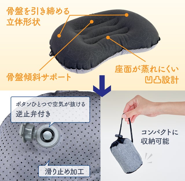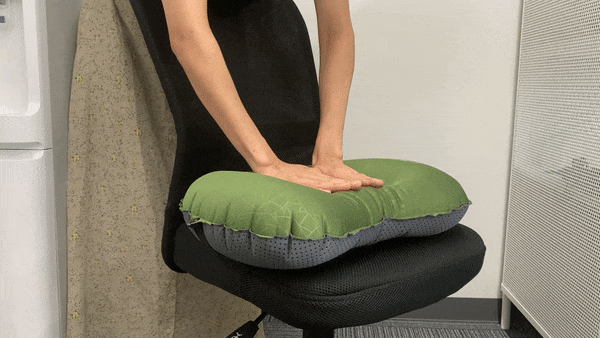 膨らませた後は、普段使用している椅子に載せて、その上に座るだけ。また、空気を抜く時は逆止弁のボタンを押しながら簡単に抜くことができます。