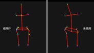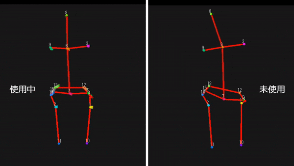 使用していない時は、頭・背骨・肩・膝に付けたマーカーが左右に大きくブレしまい、身体の軸が全く定まっていないことが分かります。