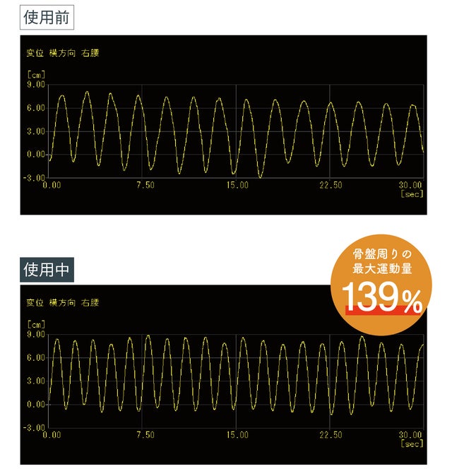 使用中のグラフは、縦軸の振れ幅が大きい=沢山動いていることが分かります。時間軸で見ても使用中の方が、30秒の間により多く動いており、使用前に比べて運動量が139%になりました。