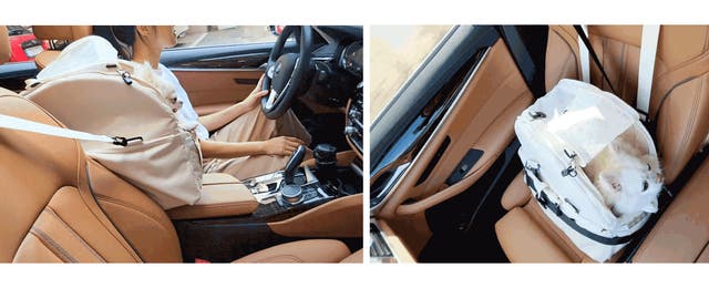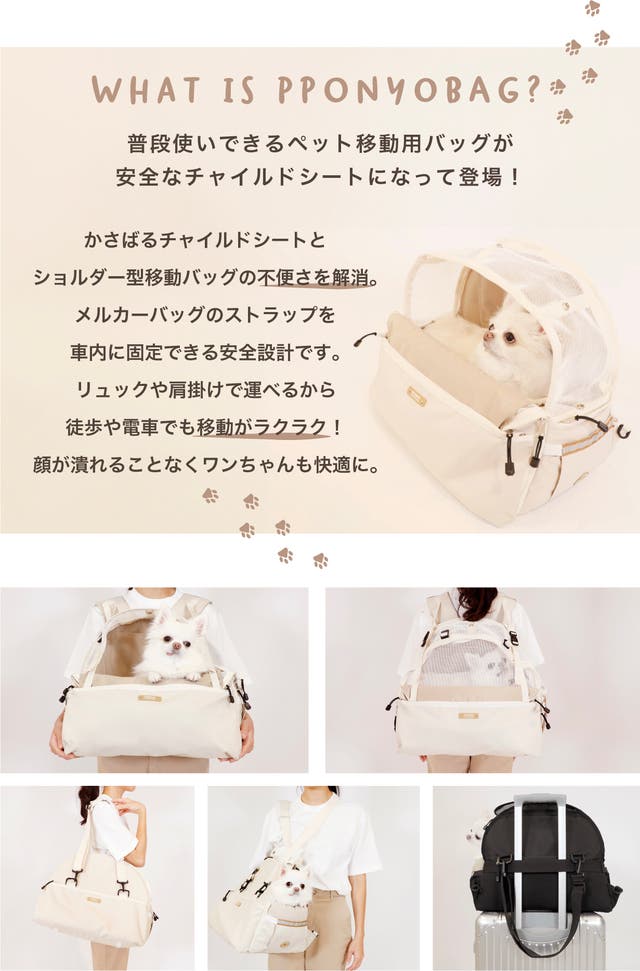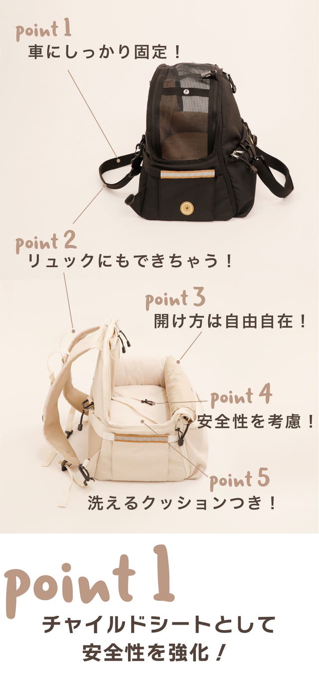 チャイルドシート、普段愛犬が使用するハウス、移動用品の融合というキーワードで、愛犬には日常生活で慣れたチャイルドシートで恐怖を減少させ、快適さを提供し、飼い主の方々にはかさばるチャイルドシートとショルダー型の移動バッグの不便さを解消するために、背負えるチャイルドシートを開発しました。