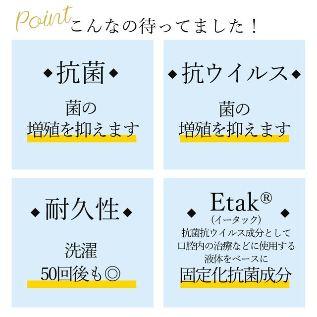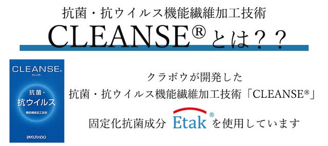 抗菌・抗ウイルス機能繊維加工技術「CLEANSE®/クレンゼ®」は、固定化抗菌成分「Etak®/イータック」を活用し、繊維表面に強力に固定化する加工技術です。洗濯50回後も効果を確認。