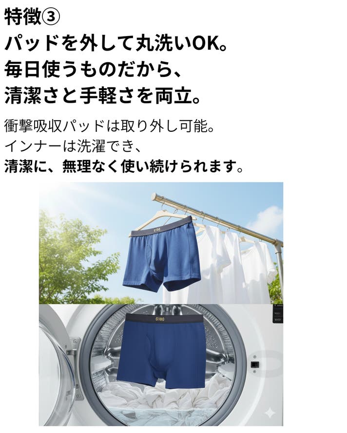 - 衝撃吸収パッドは着脱式。薄型でアウターに響かずインナー部分は洗えて清潔に日常使いできます