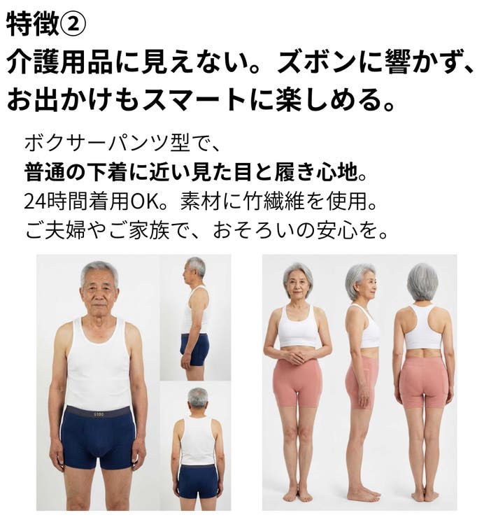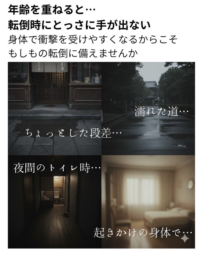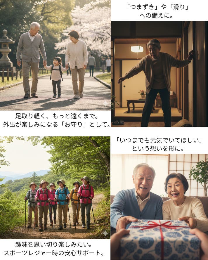 - 加齢に合わせ転倒時のリスクに備える。身体で衝撃を受けにくくサポートするインナー