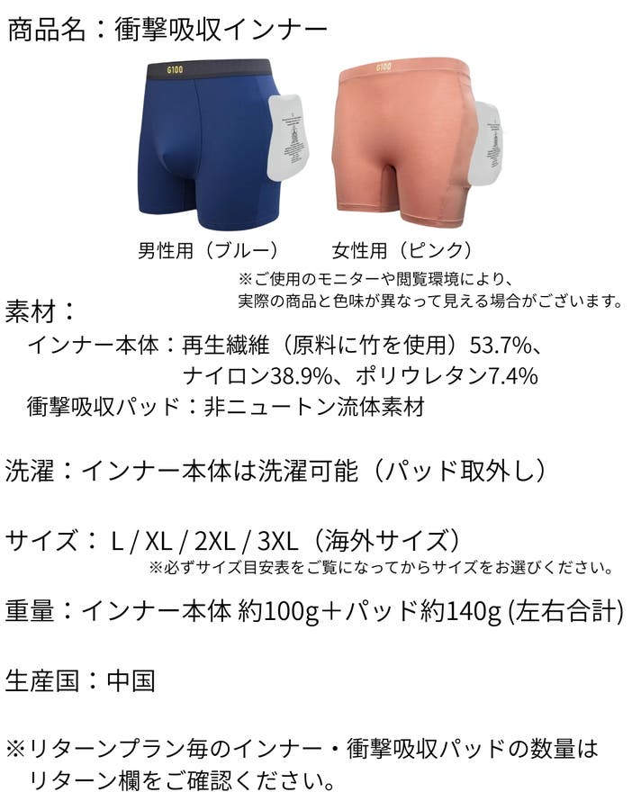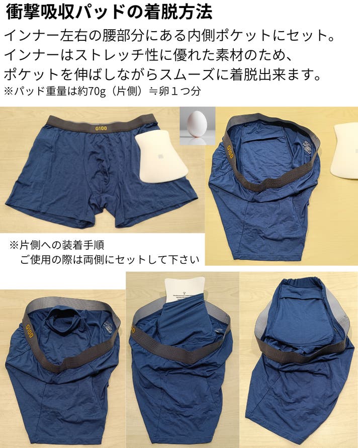 インナーはパッドを装着して使用するための専用設計となっており、パッドと組み合わせてご使用いただくことで、転倒時などの衝撃吸収効果を発揮します。